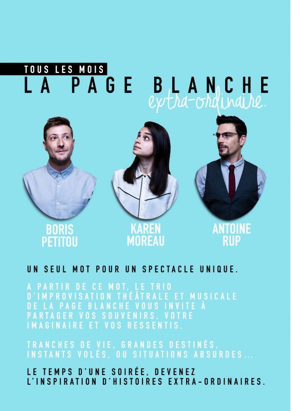 La troupe "La Page Blanche" retient un seul mot parmi vos propositions. A partir de ce mot Karen, Boris et Antoine improvisent des histoires en musique : tranches de vie, instants volés ou situations absurdes....